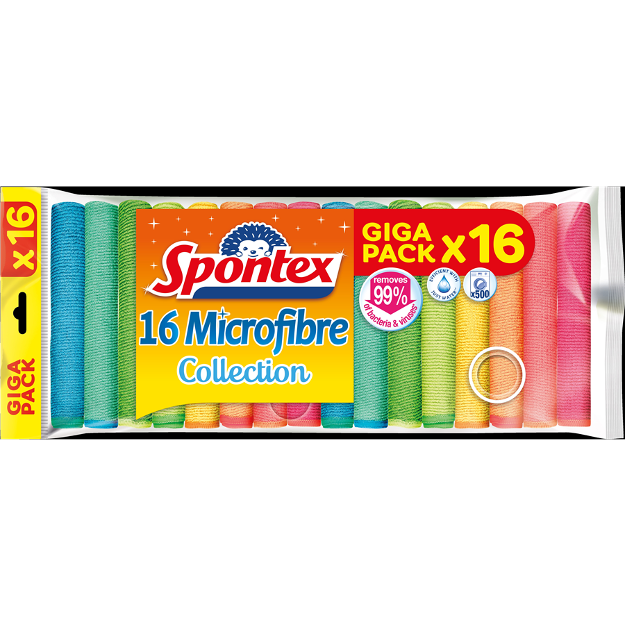 GIGA balení utěrek z mikrovlákna Spontex, které jsou super odolné a savé. Tyto víceúčelové utěrky z mikrovlákna jsou velmi účinné i bez detergentů a odstraňují nečistoty, mastnotu, bakterie a viry pouze vodou. Balení obsahuje 16 utěrek.